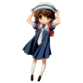 古河渚,Key社制作的游戏《CLANNAD》中的女主角。小时候的一次意外后变得体弱多病,因此留级过两年。性格积极,有着复活演剧部的梦想,但由于缺乏自信,通常容易被周围的人们所忽视。在留级第一年后与男主角冈崎朋也邂逅,与朋也的相处令她得到了勇气,决心开始向着创立演剧部的梦想迈进。之后与朋也交往并结婚,生下女儿冈崎汐。